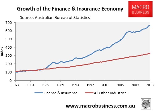Since financial markets were deregulated in the mid-1980s, the finance and insurance industries – which are dominated by mortgage lending – have grown at more than twice the pace of the rest of the economy, due in part to the housing quango operated by the various levels of government (see below charts).