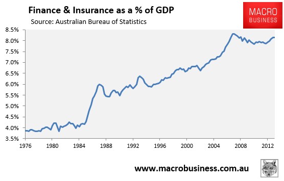 In a nutshell, resource allocation has for decades been channeled away from the tradable sector and infrastructure investment towards the financial sector, as home buyers have taken on ever-bigger mortgages as they chased house prices higher.