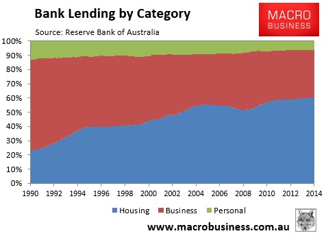 In turn, Australia’s housing obsession has starved productive sectors of the economy of credit. In the early 1990s, Australia’s banks lent nearly two-thirds to businesses, with the balance split between housing and personal lending. However, after the mid-1990s explosion of housing values, these ratios have reversed, with housing lending dominating at the expense of businesses (see next chart).