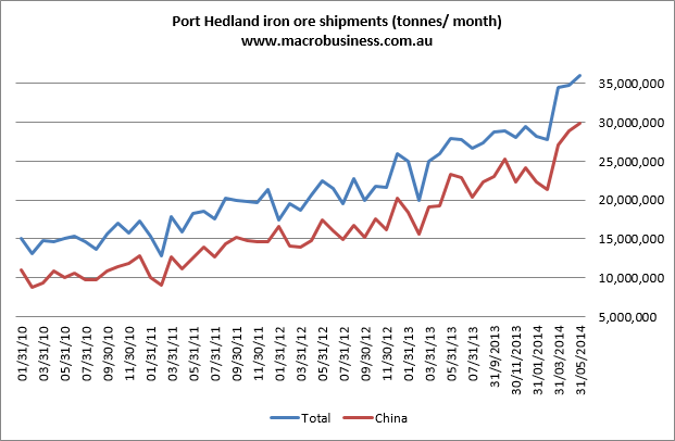 Port Hedland has released its May shipping data today and the volume ramp up continues with 36 million tonnes shipped on the month, up 3.5% from April and 31% year on year. It has to be said, however, that year on year growth is now starting slow, down from almost 40% a few months ago. As the year goes on, it will fall right away (which is also why today’s GDP blowoff won’t last):