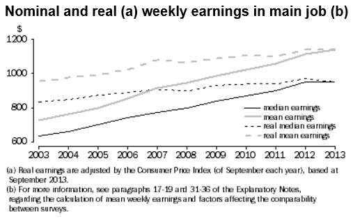 Real (earnings adjusted by CPI) median weekly earnings in main job fell by 2.1% in the year to August 2013, the largest fall in a decade. Real mean weekly earnings were essentially unchanged (a fall of 0.2%). However, in the previous year (from August 2011 to August 2012), real median and real mean weekly earnings in main job each rose by 3.5%. Over the decade to August 2013, real median weekly earnings rose by 14% while real mean weekly earnings rose by 20%.