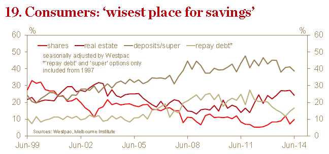 ― The Jun survey included an update of questions on the ‘wisest place for savings’ used to construct the Westpac Consumer Risk Aversion Index. The results show little change, with a very slight tilt towards risk aversion following a bigger rise in Mar. Attitudes are still much more relaxed than in early 2013.