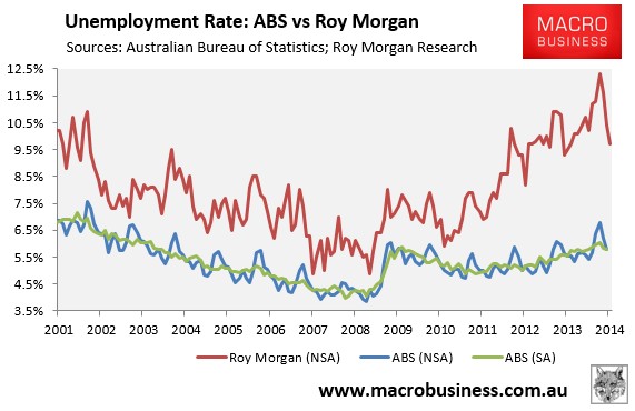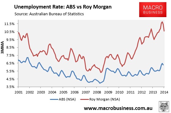 Since Roy Morgan uses a broader definition of unemployment than the ABS, it necessarily reports a higher unemployment figure. In addition, Roy Morgan’s measure tends to be far more volatile, owing to the fact that it draws on a smaller sample than the ABS and is not seasonally adjusted.