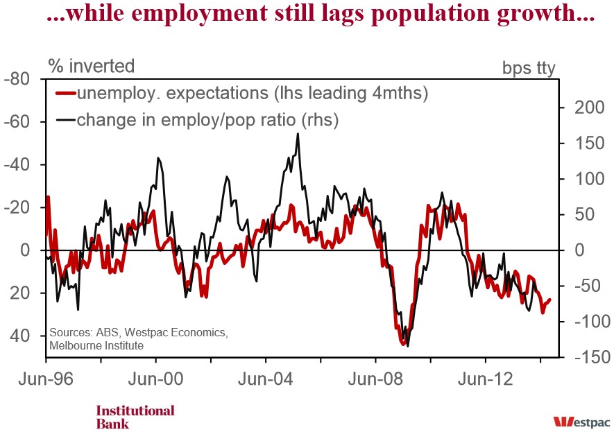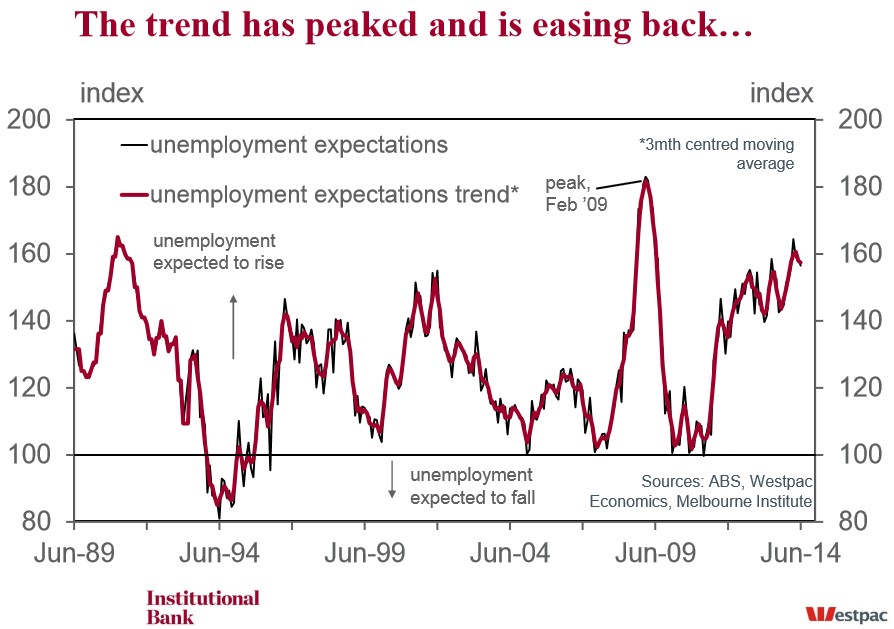 Westpac’s job index, a composite of the various business surveys, continues suggest the labour market will remain sound and that unemployment expectations can ease further.