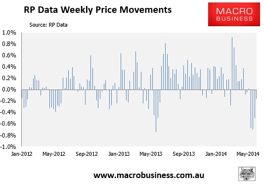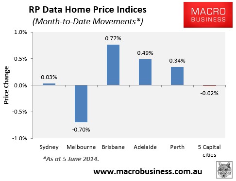 In the week ended 5 June 2014, the RP Data-Rismark 5-city daily dwelling price index, which covers the five major capital city markets, fell by 0.17%. It was the fourth consecutive week of falls (see next chart).
