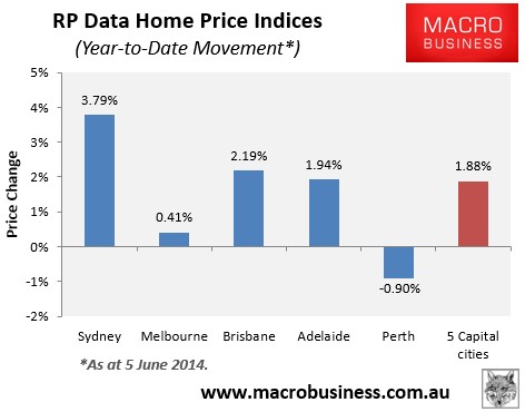 Values are now up by 1.88% so far in 2014, driven by solid gains in Sydney, Brisbane and Adelaide, with Perth values under water:
