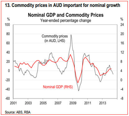 Given commodity prices will likely fall right through to 2020, that looks like a long and difficult decline ahead in nominal growth, because of the peculiarities of Asian engagement. As MB keeps saying, GDP may look OK but it won’t feel very good as Australian standards of living keep falling.