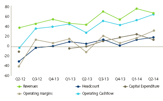 Business metrics for the coming year remain strong with 68% net of CFOs expecting revenues to increase and a net 66% expect operating cash flows to rise