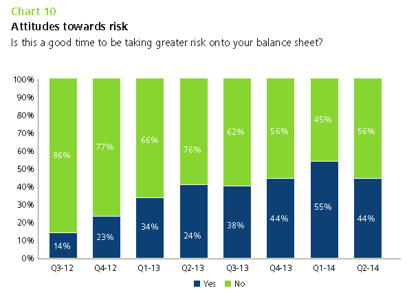 Risk appetite of CFOs has fallen from the record highs of last quarter but 44% still believe now is a good time to take on more risk