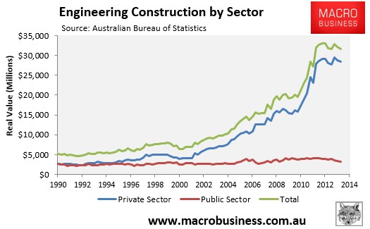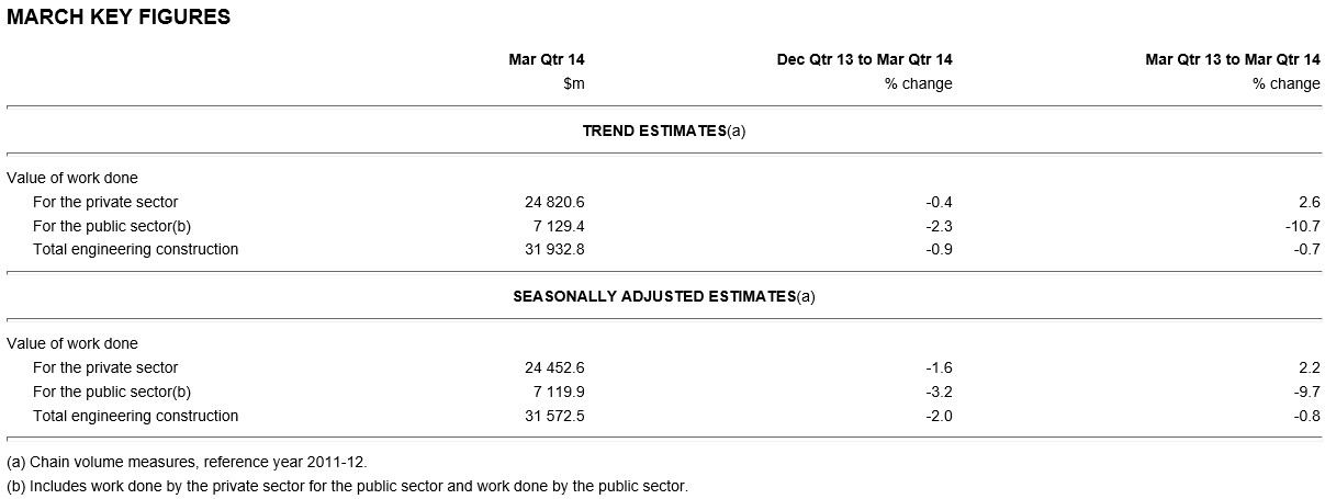 The ABS this morning released engineering construction data for the March quarter of 2014, which revealed a 2.0% seasonally adjusted fall in the value of work done over the quarter, and a reduction in the construction pipeline.