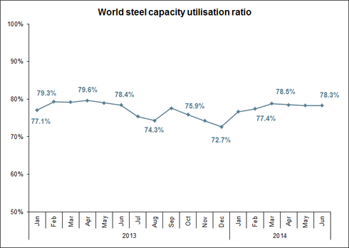 The crude steel capacity utilisation ratio for the 65 countries in June 2014 was 78.3% which is -0.1 percentage points lower than June 2013. Compared to May 2014, it remained the same.