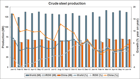 World crude steel production for the 65 countries reporting to the World Steel Association (worldsteel) was 137 million tonnes (Mt) in June 2014, an increase of 3.1% compared to June 2013.