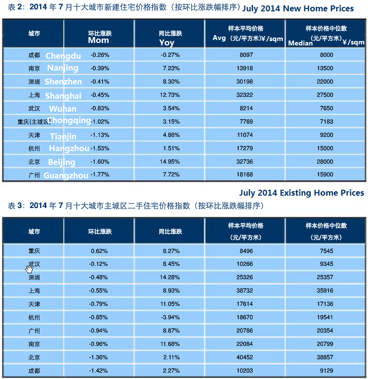The first list below is 100 cities with month on month price changes, followed by average and median price per sqm. Below that are the 10 largest cities broken out along with existing home price changes. All of them saw new home prices decline in July; only Chongqing saw an increase in existing home prices.