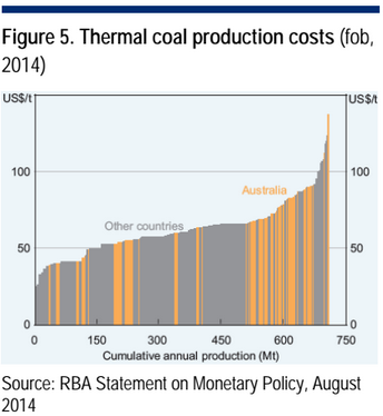 I’d have been quite happy to have written off the lion’s share of Australia $70 billion in planned coal projects at this juncture were it not for the marked persistence of the massive Galilee Basin Adani project which is still lining up partners to go ahead. Even so, if it can raise the dough I’ll be very surprised. The project is immensely expensive and high on the cost curve and will add 60 million tonnes per annum to an already oversupplied seaborne market. Even the perennially optimistic Bureau of Resource and Energy Economics (BREE) can’t find enthusiasm for thermal coal prices, and it still expects Chinese demand to continue to grow at 2% per annum, and Indian at 4%. As the RBA noted just this week, we’re at the wrong end of the cost curve and mines will have to close:
