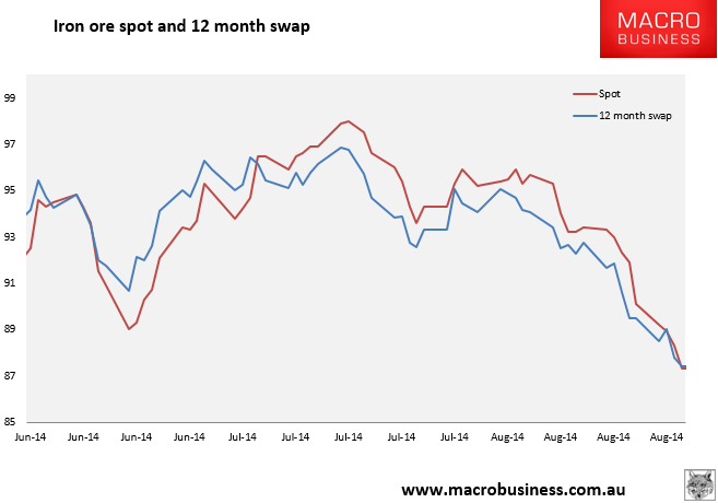 The benchmark iron ore price fell another $1 to $87.30 within a whisker of the post-2009 low at $86.70 and it’s going to break. A small contango with long swaps has reformed but given the broader weakness in paper remains unconvincing as a turning signal.
