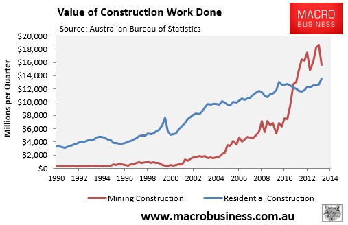 Carr’s claim that employment is “set to surge following the spike in construction, business conditions and confidence” is also dubious. Again, he might like to look at the below chart comparing mining construction against residential construction, and then think long and hard about whether his so-called ‘construction boom’ will be enduring: