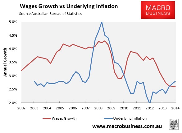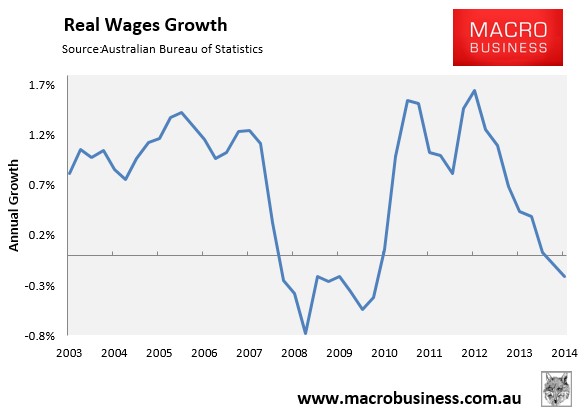 When adjusted for underlying inflation, annual wages fell for the second consecutive quarter, down 0.2% in the year to June 2014 (see below charts).