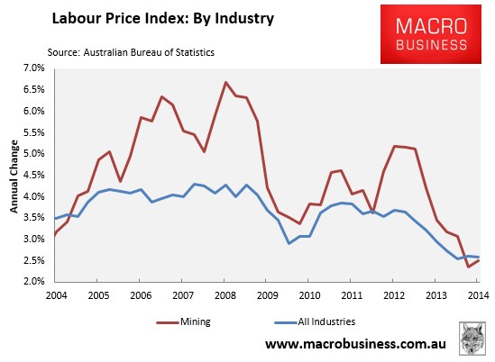 Not surprisingly, the mining sector is the cause of the decline, with wages growth in mining just 2.5% in the year to June, albeit growth has picked-up slightly from the March quarter (see next chart).