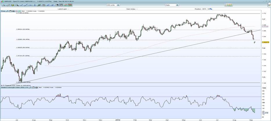Perhaps the most interesting move in the FX space today is the weakness seen in the sterling. Cable dropped from around $1.6326 to a low of $1.6166 after The Sunday Times YOUGOV poll showed the ‘yes’ vote for Scotland’s independence from the UK ahead for the first time. The poll put the yes vote at 51% with the unionists at 49%. While most polls still have a ‘no’ in front, the market is now concerned that the gap between the two has closed significantly only a couple of weeks before the referendum. A concern here is that the market is yet to price in the chaos that would stem from a yes vote on September 18 – particularly the currency Scotland would use and how their debt would be treated. While traders will be waiting to see the gap from today’s open filled, there is a good chance we’ll see cable extend its losses in the near term. There is resistance in the $1.6286 region – the 38.3% retracement of the July 2013 low to July 2014 high.