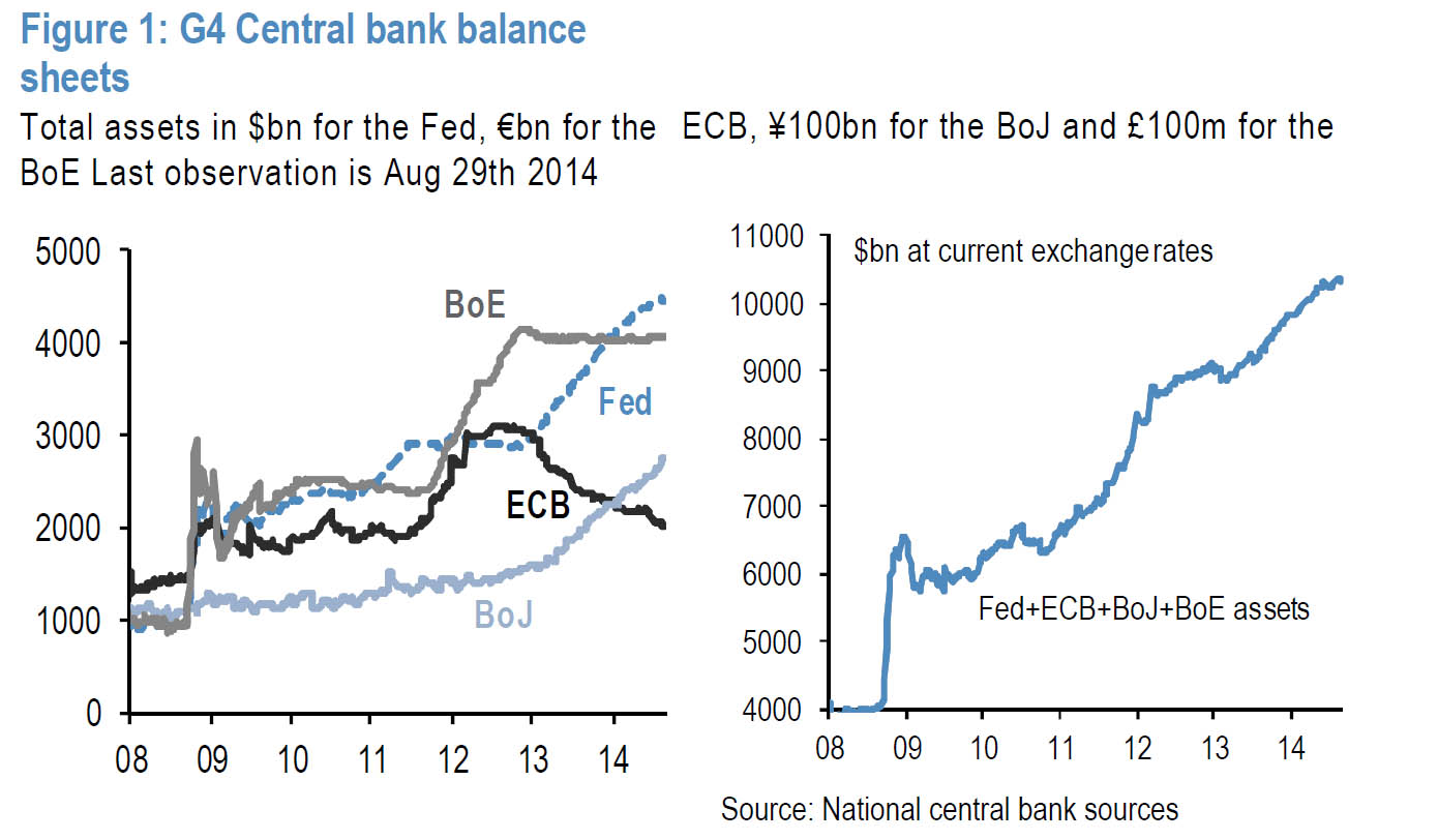 In aggregate, G4 central balance sheets started rising rapidly from the end of 2010 driven by the Fed’s QE2 followed by the BoE’s QE, ECB’s LTROs, Fed’s QE3 and BoJ’s QE. As a result of these central bank actions, G4 central bank balance sheets expanded by almost $4tr over 4 years i.e. by $1tr per year since the end of 2010 (Figure 1). With the ECB aiming at a €1tr expansion of its balance sheet, this $1tr per year pace in G4 central bank balance sheet expansion is likely to increase rather than decrease from here, despite the Fed’s tapering. The BoJ is already expanding its balance by close to $650bn per year, so adding a similar pace of increase for the ECB’s balance sheet (€500bn or $650bn per year) should result in an annual pace of G4 central bank balance sheet expansion of $1.3tr, even as the Fed ceases bonds purchases.