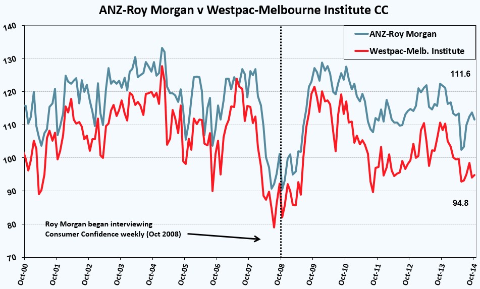 The below chart plots the most recent Westpac-Melbourne Institute Consumer Sentiment index against the ANZ-RM Consumer Confidence index, which shows some divergence recently: