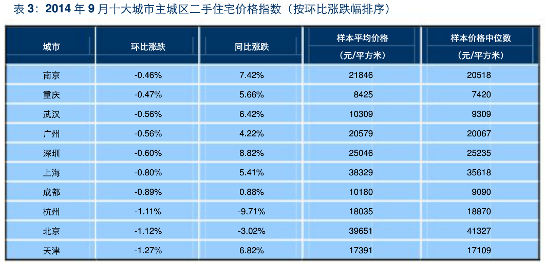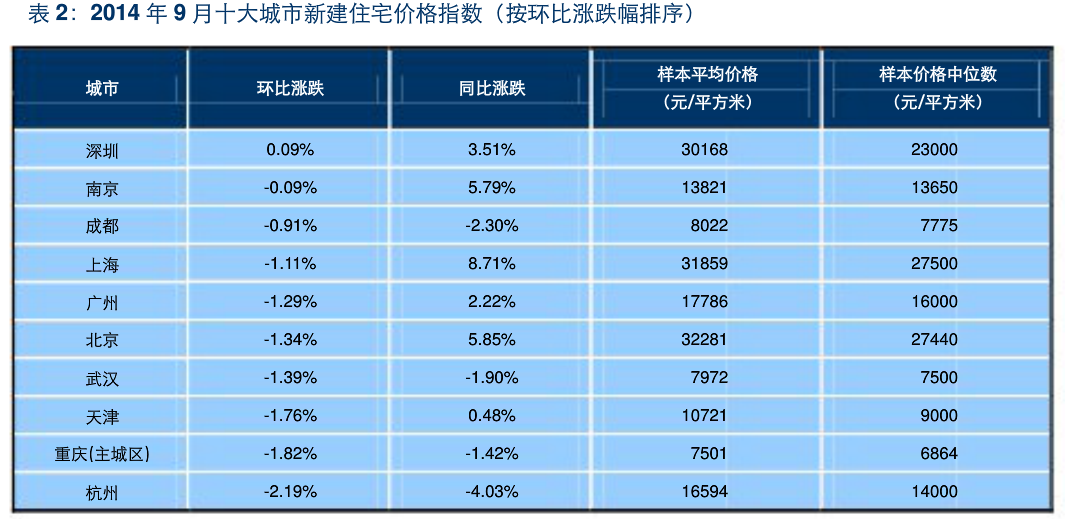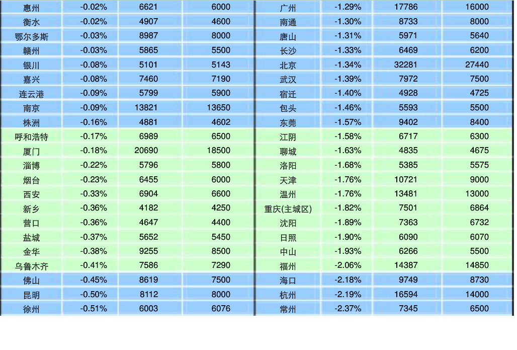 The ten largest cities saw losses across the board in existing homes (last table) and only Shenzhen saw a price increase for new homes (second to last table) in September.