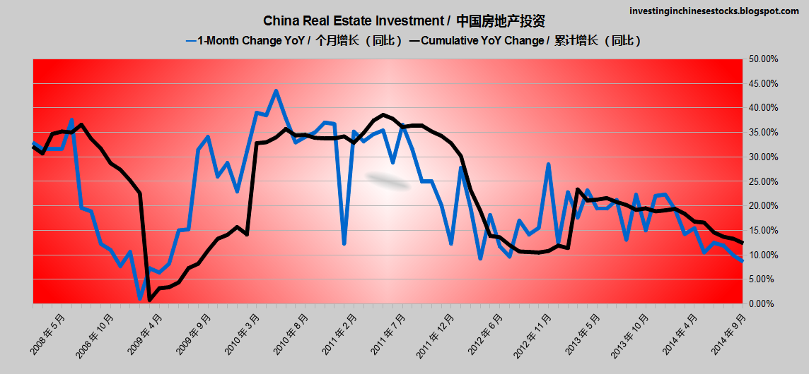 The lift in sales has some work to do. Here’s a chart showing Chinese real estate investment by month compared to the cumulative figure. Absent a trend change, you can see where that cumulative growth line is headed: