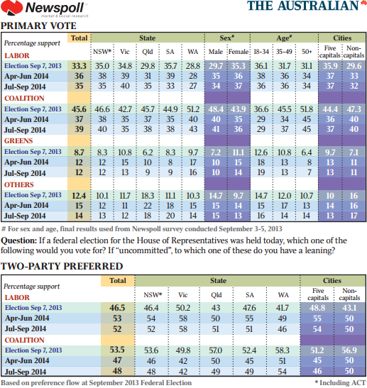 After being savagely marked down in the June quarter on the back of the poorly received budget, Mr Abbott’s personal standing has improved in the September quarter in every state except Queensland and across every age group, among men and women, as well as city and country voters.