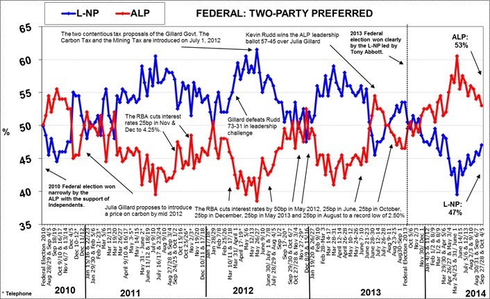 In early October L-NP support rose to 47% (up 1.5%) but still trails the ALP 53% (down 1.5%) on a two-party preferred basis. If an election had been held the ALP would have won according to this week’s Morgan Poll on voting intention conducted with an Australia-wide cross-section of 3,151 Australian electors aged 18+ over the last two weekends.