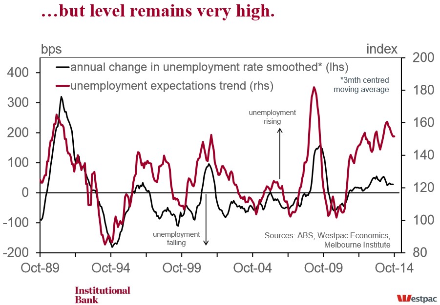 Westpac has released its Australian Consumer Unemployment Expectations Survey for October, which revealed an improved jobs outlook amongst Australian consumers, with the index falling 3.9% in October – the largest monthly fall in just over a year – taking it 9.6% below its March 2014 peak. A lower reading from the index indicates reduced concern around the labour market.