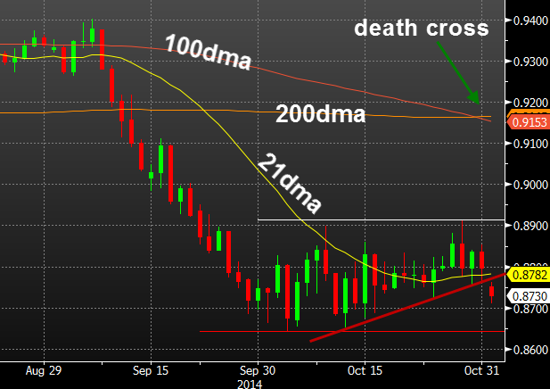 The next potential big event would be a break below the October low of 0.8643. That would leave very little support ahead of the 2010 low of 0.8067.
