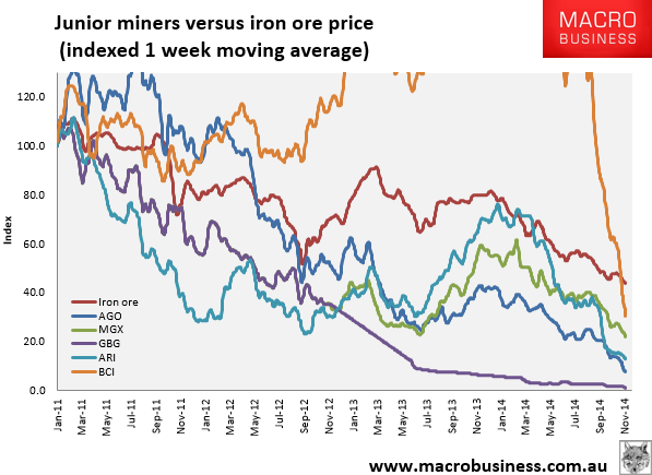 Pain is turning to agony and near death for iron more miners today. As predicted, FMG has ruptured terminal support at $2.92 and is currently down 6%+ at $2.79, next stop $1.80 and restructuring. RIO is down sharply too at $58.63, still above its 2014 low, ridiculously. BHP is faring a little better. Here are the comparative indexes: