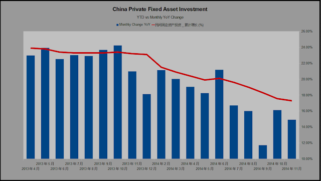 Digging into the numbers reveals the same trend in the other data sets. November data is the second weakest for the year after September. The October spike is a bounce, not a trend yet. Private fixed asset investment slowed to 14.9% in November; it was 11.7% in September. Below trend growth is the story of 2014 and 2015 will likely open with a big drop in growth that will “surprise” anyone watching the year-to-date cumulative figures.