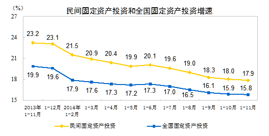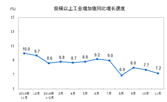 Industrial production continues to slow. Looking at the breakdown of data from the report, the real estate slowdown is still having a big impact. Cement production fell 4% in November; plate glass contracted 6.3%. More concerning for the broader economy is the 4.5% drop in auto production, as well as the 0.6% growth in electricity production, which is now only up 3.9% ytd in 2014.