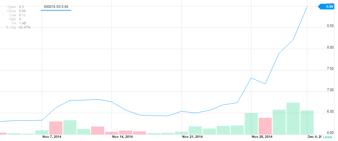 Meanwhile, capital is pouring into the stock market. Mingsheng Bank (600016.SS) is up about 40% in the past two weeks. This article from 21st CBH discusses how capital has been flowing into the stock, and how it set a new record for daily volume at ¥15.2 billion yesterday.