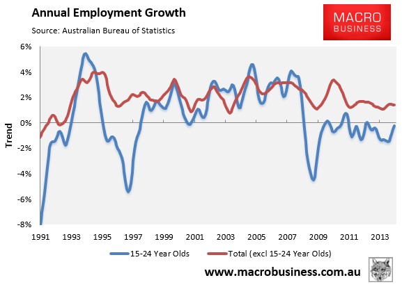 Yesterday’s soggy labour force data for November revealed even more bad news for Australia’s youth, with unemployment for those aged 15 to 24 years old rising to 14.1% in trend terms (from October’s revised 14.0%) – the highest youth unemployment rate since September 1998.