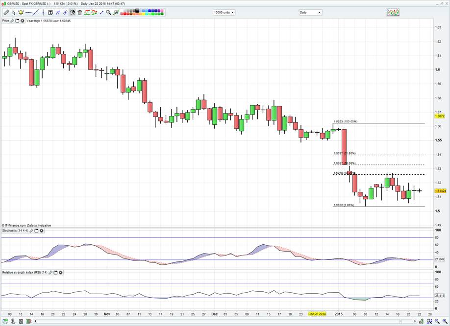 The script continues to shift from day to day. The Bank of England is reacting to falling price pressures and we’re now seeing a board united in keeping interest rates steady. This change shouldn’t surprise given inflationary trends and GBP/USD seems to have found good bids below $1.51. The trend is lower though, so I would be adding to shorts on a close below the 8 January low of $1.5034, or into supply at $1.5258 (the 38.2% retracement of the year’s sell-off). It seems we are not going to see rates going up until Q2 2016. This is a massive swerve given how many were calling for price ‘normalisation’ in Q4 2014.