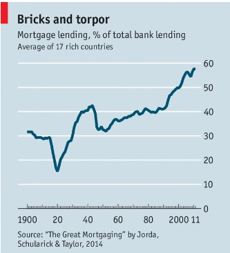 … the traditional view that banks primarily lend to businesses is out of date. In 1900 only 30% of bank lending was to buy residential property; now that figure is around 60% (see chart). Since the 1970s virtually the entire increase in the ratio of private-sector debt to GDP around the world has been caused by rising levels of mortgage lending. Corporate borrowing has remained flat. Far from channelling money to companies, modern banks resemble “real-estate funds”… in which long-term mortgage lending is funded by short-term borrowing from the public.