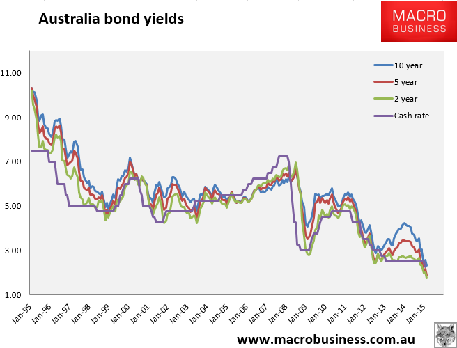 The bond market rip is something to behold today with new all time lows on 2 year yields all the way down to 1.76%, pricing two full rate cuts. The five year equaled its lowest ever yield and the ten is lagging a little: