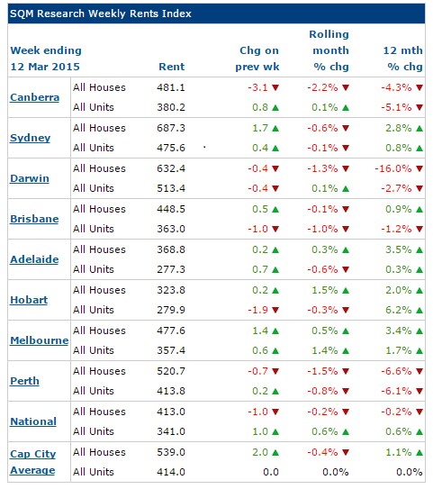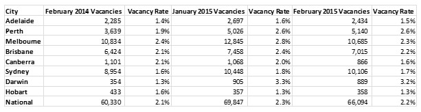 …the vacancy rate kept climbing in Darwin and Perth, reflecting the impact of the commodities downturn, which is weighing on employment and property markets in Western Australia and the Northern Territory. Managing Director of SQM Research, Louis Christopher, said vacancy rates in Darwin and Perth will probably keep climbing through 2015 and could edge up nationally if the jobless rate rises further. “While unemployment fell slightly in February, a slowing Australian economy overall will likely place greater upward pressure on the nation-wide vacancy rate though 2015,” he said.