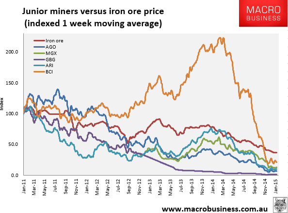 There’s no doubt about financial repression. The price of the only thing that you sell can crater yet your own equity value can still soar. It’s magic! RIO is covered in such fairy dust today as it marches higher 2% on the Chinese rate cut and BHP is up a little less. Alas for FMG the truth will out and it is unable to rise as Dalian iron ore futures fall 2 points in the knowledge that China’s structural adjustment remains fully on track. Here are the indexes:
