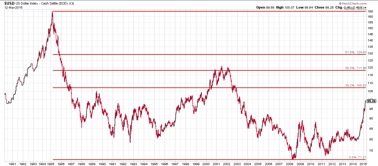 Here are some possible targets for the US Dollar Index if it breaks out. If the index does a 50% retrace to 118, that would be another 18% gain for the dollar and a drop to about $0.88 on the euro. If the retrace goes to 129, the euro could sink as low as $0.77. A full 100% retrace back to the 1985 would imply a euro trading at $0.44. Instead of being the Deutschmark II, it would become the new incarnation of the lira and drachma.