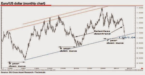This chart of the euro is from Societe Generale, which goes back to the 1980s. (The euro didn’t exist back then, so a basket of the euro member’s currencies is used instead). The $1.05 level marks the bottom of the long-term uptrend in the common currency. In a separate view, technical trader Tim Knight also identified the $1.05 level as being crucial: