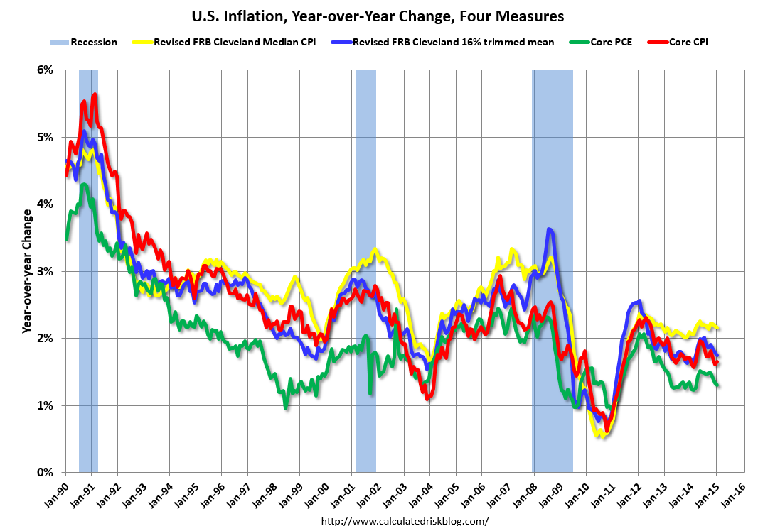 That was in line with expectations though core was 0.1% higher. The analytical series remain well below the Fed’s 2% target (chart from Calculated Risk):