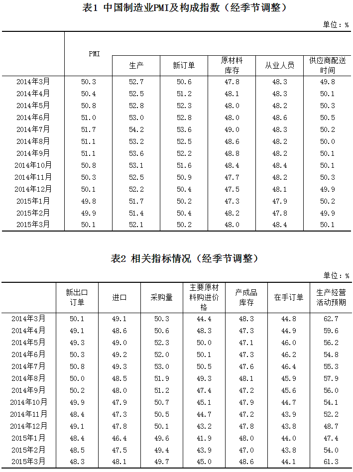 The latest PMI report (2015年3月中国制造业采购经理指数为50.1%) gave a reading of 50.1, barely positive. The breakdown was as follows: