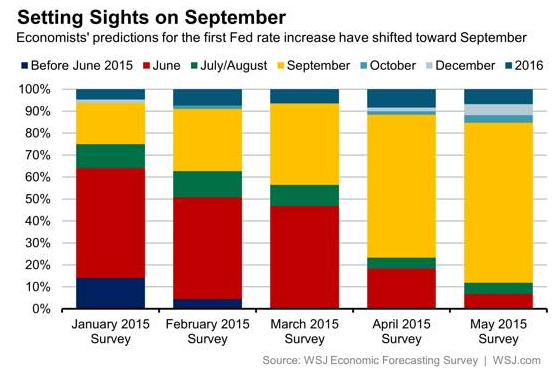 This week’s poor retail sales numbers for April in the US have really put to question the firmness of future rate hikes, confirming a poor Q1 GDP print even as job numbers look good, wage inflation remains positively stagnant. This survey from the WSJ via the chaps at ForexLive have the majority of economists seeing a Sept 2015 hike: