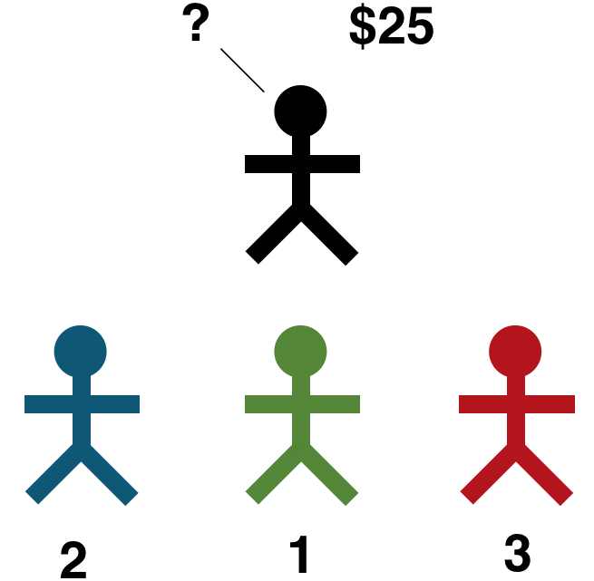 Obviously the best thing to do is form a back-scratching alliance with one other player and trade the $25 favour back and forth. Over 25 rounds an alliance pair would make $625, while the other two would make nothing.