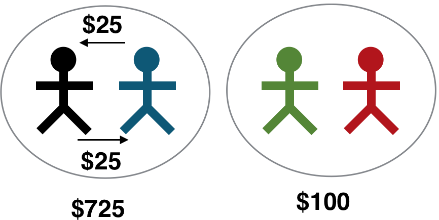 To sustain a back-scratching alliance means not choosing the most productive player for the prize in two-thirds of the rounds. It earns the alliance $725, the outside group $100, and comes with an efficiency loss of $100 from the repeated non-productive choices.