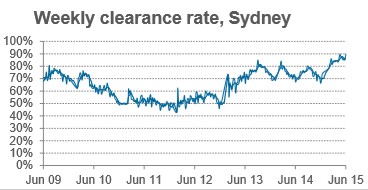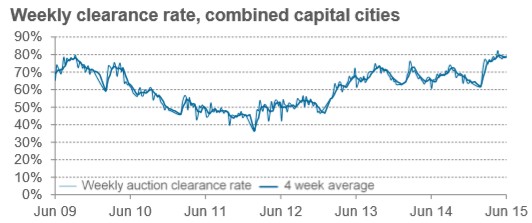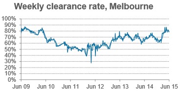 As shown in the next chart, Melbourne auction clearances are locked at a high level, up 16.0% over the year: