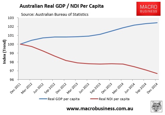 As you can see, we are only a smidgen above the GFC low with much further still to fall. And since the terms-of-trade measures the price received for Australia’s exports relative to the price paid for imports, the sharp fall in the terms-of-trade suggests that national disposable income (NDI) will register another decline in the March quarter, continuing the trend in place since late-2011 (see next chart).